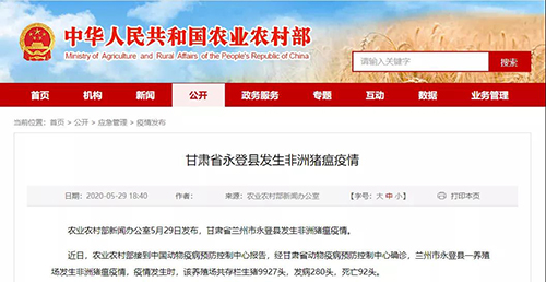 甘肅省永登縣發(fā)生非洲豬瘟疫情 農(nóng)業(yè)農(nóng)村部新聞辦公室5月29日發(fā)布,甘肅省蘭州市永登縣發(fā)生非洲豬瘟疫情?! 〗眨r(nóng)業(yè)農(nóng)村部接到中國動(dòng)物疫病預(yù)防控制中心報(bào)告,經(jīng)甘肅