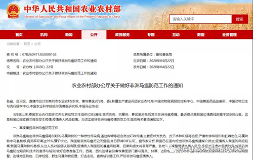 4月22日,農(nóng)業(yè)農(nóng)村部辦公廳發(fā)布了關(guān)于做好非洲馬瘟防范工作的通知,強(qiáng)調(diào)各地要高度警惕境外非洲馬瘟傳入風(fēng)險(xiǎn),密切關(guān)注境外疫情動(dòng)向,加強(qiáng)非洲馬瘟防控知識(shí)和技術(shù)的宣傳與培訓(xùn),做