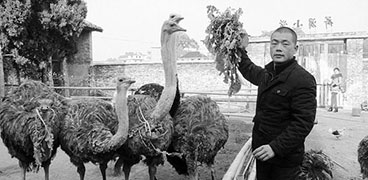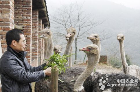 1月7日,資興市回龍山鴕鳥養(yǎng)殖基地,養(yǎng)殖戶黃永輝正在給鴕鳥喂食鮮草。黃永輝在該市承包百畝荒山養(yǎng)殖鴕鳥,年出欄商品鴕鳥近100頭,鴕鳥肉、鴕鳥蛋及鴕鳥蛋工藝品供不應(yīng)求。近