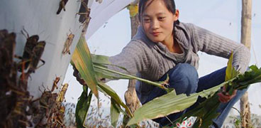 10月27日,山東高青縣青城鎮(zhèn)小河溝村農(nóng)村婦女劉小娟在棚內(nèi)給養(yǎng)殖的蝗蟲喂食?! 〗陙?,蝗蟲作為純天然的綠色食品逐步走上人們餐桌,市場需求旺盛。高青縣青城鎮(zhèn)利用飼草資