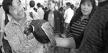 昨天,記者在第七屆金華·華東農(nóng)交會(huì)上看到,許多人圍著一只長(zhǎng)著鮮艷羽毛的山雞觀看,還不時(shí)有人向攤主詢問(wèn)山雞的有關(guān)問(wèn)題。山雞是由金華市東垅錦鳳山雞特種養(yǎng)殖場(chǎng)提供