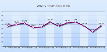 據(jù)“中國·海寧皮革指數(shù)”信息系統(tǒng)監(jiān)測,2012年3月第2期周價格總指數(shù)報收于113.44點,上漲 6.83點,漲幅為6.41%,指數(shù)小幅上漲?! ∑渲蟹b類周價格指數(shù)收于