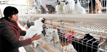 紅墻藍頂?shù)酿B(yǎng)殖房,標準化建設的兔圈被分隔成上下兩層,一只只活潑的長毛兔或好奇地探出頭來,欲尋食覓菜,或機靈地豎起耳朵,一旦聽到圈外有異樣聲音,連忙蹦跳著躲進兔圈暗角處。