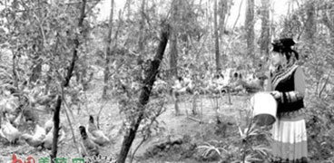 代云花給放養(yǎng)的生態(tài)土雞喂食 山林郁郁蔥蔥,防護(hù)網(wǎng)環(huán)繞山林,樹下成群結(jié)隊(duì)的土雞悠閑地覓食。6月6日,記者走進(jìn)南江縣赤溪鄉(xiāng)四營村彝族婦女代云花的生態(tài)土雞養(yǎng)殖場,只見這里