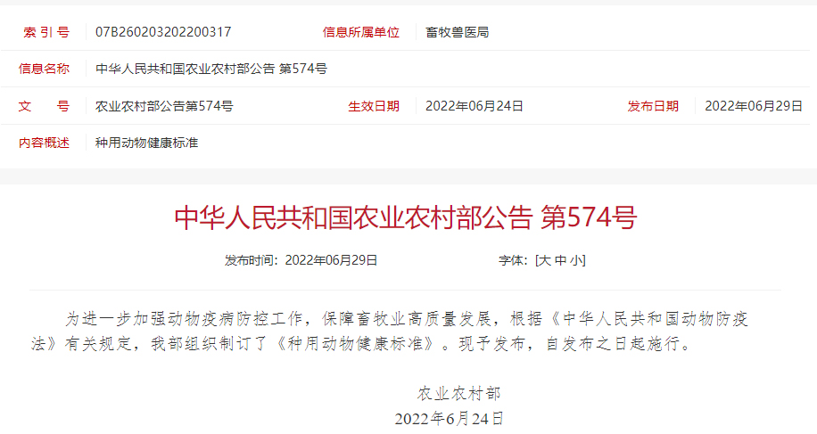 為進一步加強動物疫病防控工作,根據(jù)《中華人民共和國動物防疫法》有關規(guī)定,農(nóng)業(yè)農(nóng)村部組織制訂了《種用動物健康標準》并于6月29日發(fā)布,即日起施行。種用動物健康標準