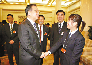 昨日,溫家寶參加十一屆全國(guó)人大一次會(huì)議廣東代表團(tuán)審議,與來自廣東佛山的農(nóng)民工代表胡小燕(右)握手。雷聲攝
