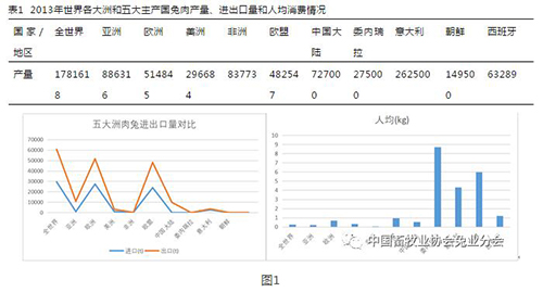 四川兔產(chǎn)業(yè)處于全國(guó)前列,其中肉兔是四川養(yǎng)殖家兔的主體。聯(lián)合國(guó)糧農(nóng)組織(FAO)官方數(shù)據(jù)庫(kù)2013年世界各大洲和五大主產(chǎn)國(guó)兔肉產(chǎn)量、進(jìn)出口量和人均消費(fèi)情況數(shù)據(jù)如表1所示。中國(guó)大陸人均消費(fèi)0.527kg是世界人均水平的兩倍多,而四川省官方數(shù)據(jù)顯示四川省人均兔肉消費(fèi)達(dá)到3.955kg,接近歐洲第一大兔肉消費(fèi)國(guó)意大利的4.315 kg。中國(guó)畜牧業(yè)協(xié)會(huì)兔業(yè)分會(huì)統(tǒng)計(jì),2016年四川共銷售近3億只兔子,年銷量增幅約10%,占全國(guó)市場(chǎng)近7成,兔產(chǎn)業(yè)成為四川農(nóng)民脫貧致富的重要途徑。自貢肉兔養(yǎng)殖居全省第一,是兔肉供應(yīng)的集中地,全國(guó)有名的養(yǎng)兔之鄉(xiāng),肉兔精深加工產(chǎn)業(yè)位居全省前列。