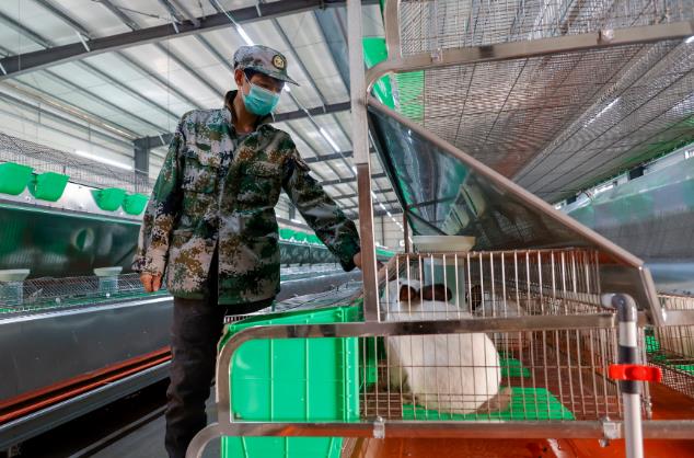 浙江省景寧縣東坑鎮(zhèn)白鶴村肉兔養(yǎng)殖場,嚴(yán)家森在觀察肉兔生長情況。